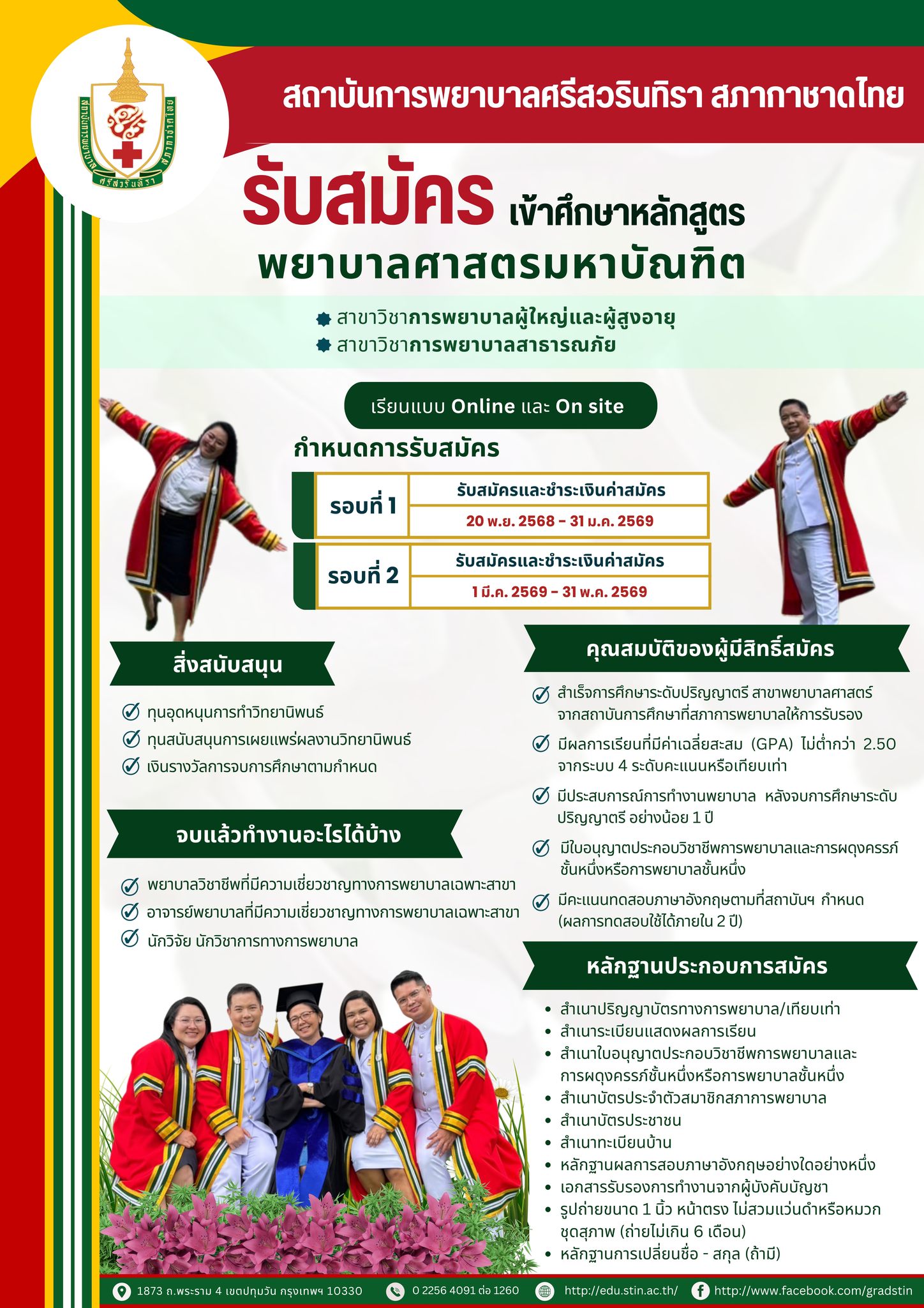 หลักสูตรพยาบาลศาสตรมหาบัณฑิต สำนักวิชาบัณฑิตศึกษา สถาบันการพยาบาลศรีสวรินทิรา สภากาชาดไทยเปิดรับสมัครนักศึกษาใหม่ ประจำปีการศึกษา 2569 เปิดรับ 2 หลักสูตร