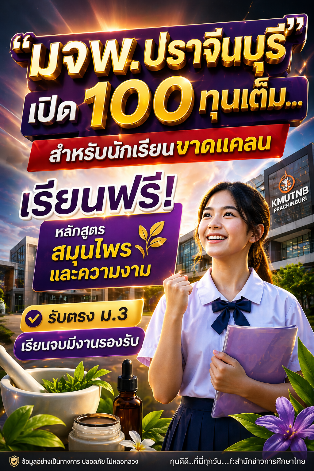 มหาวิทยาลัยเทคโนโลยีพระจอมเกล้าพระนครเหนือ (มจพ.) วิทยาเขตปราจีนบุรี เปิดรับสมัครนักเรียนเข้าศึกษาในหลักสูตรอนุปริญญา “เทคโนโลยีและนวัตกรรมสมุนไพรและความงาม (TIHB)” โดยชูจุดเด่นสำคัญคือการมอบ ทุนการศึกษา 100% จำนวน 100 ทุน สำหรับนักเรียนขาดแคลนและด้อยโอกาส เปิดโอกาสให้เรียนฟรีตลอดหลักสูตร พร้อมเสริมทักษะวิชาชีพจริงและมีเส้นทางการทำงานรองรับอย่างชัดเจน